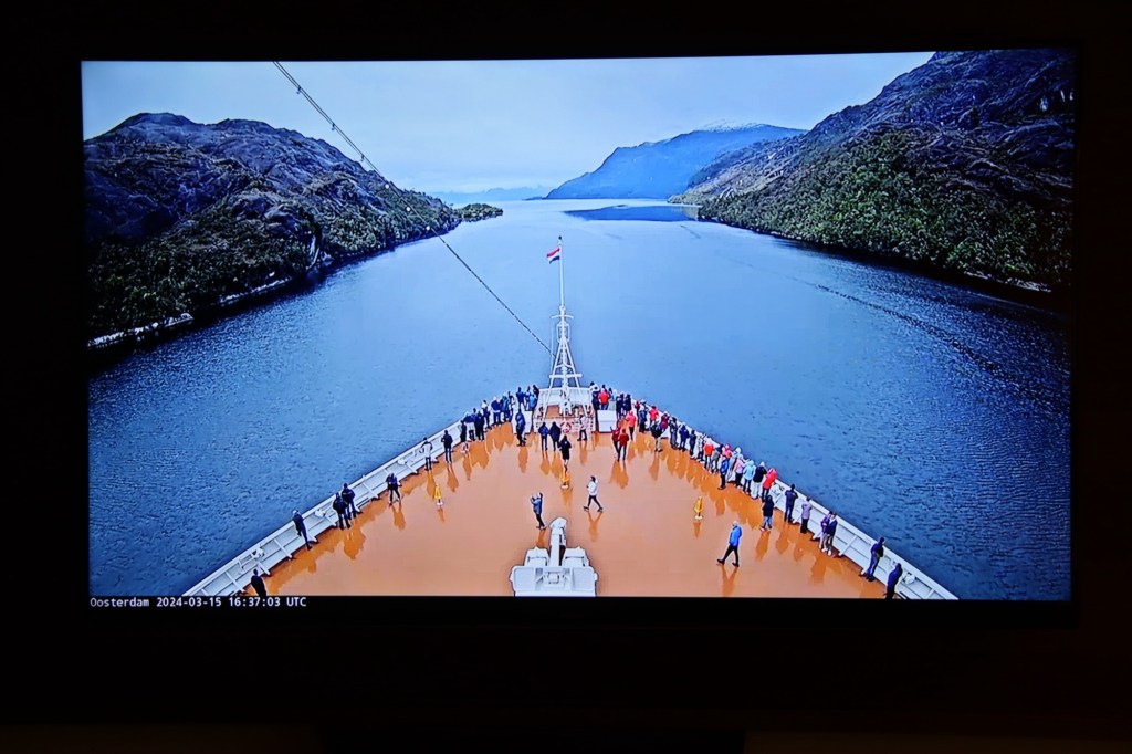 Two nights in row, the ship pulled out into the open Pacific for a short period before ducking back into the inland channels. There’s a big low pressure system pounding lower Chile off shore and up to the Andes mountains. Seas were rough. The captain announced one night we had 18 foot waves. Outside decks were closed due to the rough seas most of two days. Here on the third day at sea, things are lot calmer and warmer, with promises of nicer weather in port tomorrow. I was finally able to get my walk around the promenade in today.
