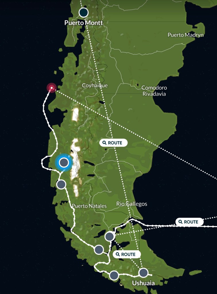 We left Ushuaia (at the bottom) on the Beagle Channel west-bound, then weaved north and east, turning west again on Cockburn Channel and then winding west and north up to the ice field (in white on the map) and pulled into a fjord ending at the Pio XI glacier. We left the glacier and proceeded past numerous fjords, pulling out into the Pacific Ocean twice on our way to Puerto Montt at the top. Here is a more detailed track of our route to the glacier and back out again. Very narrow channels.