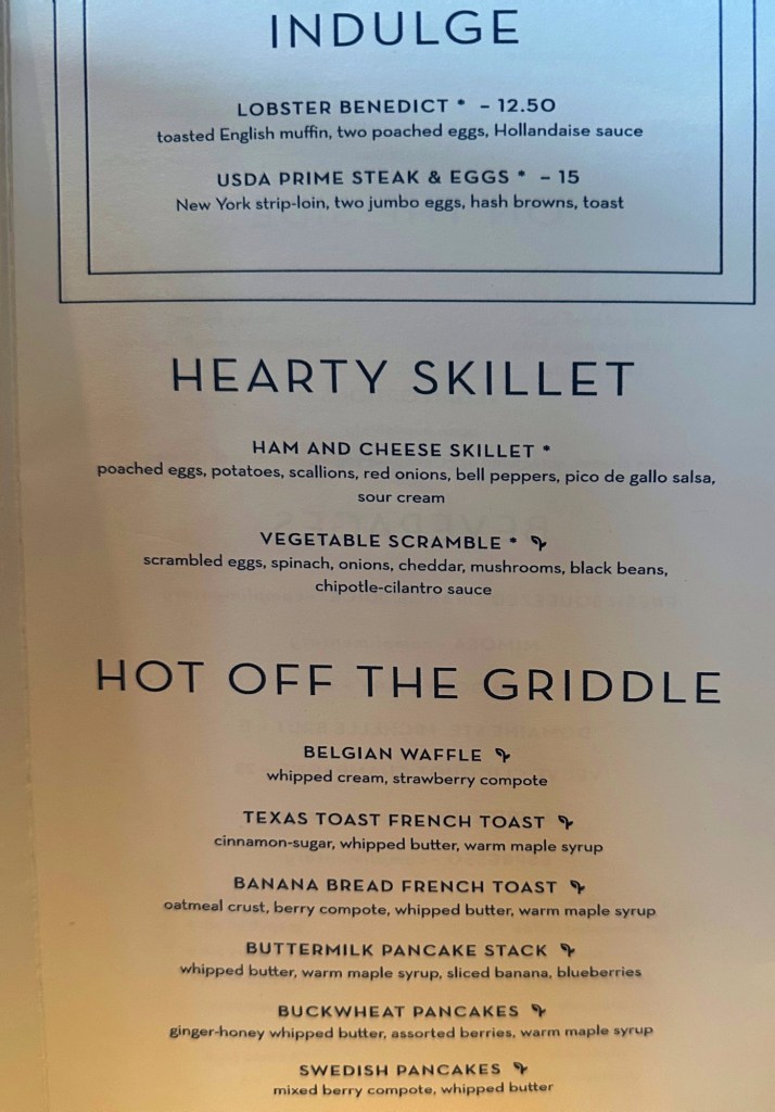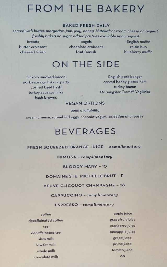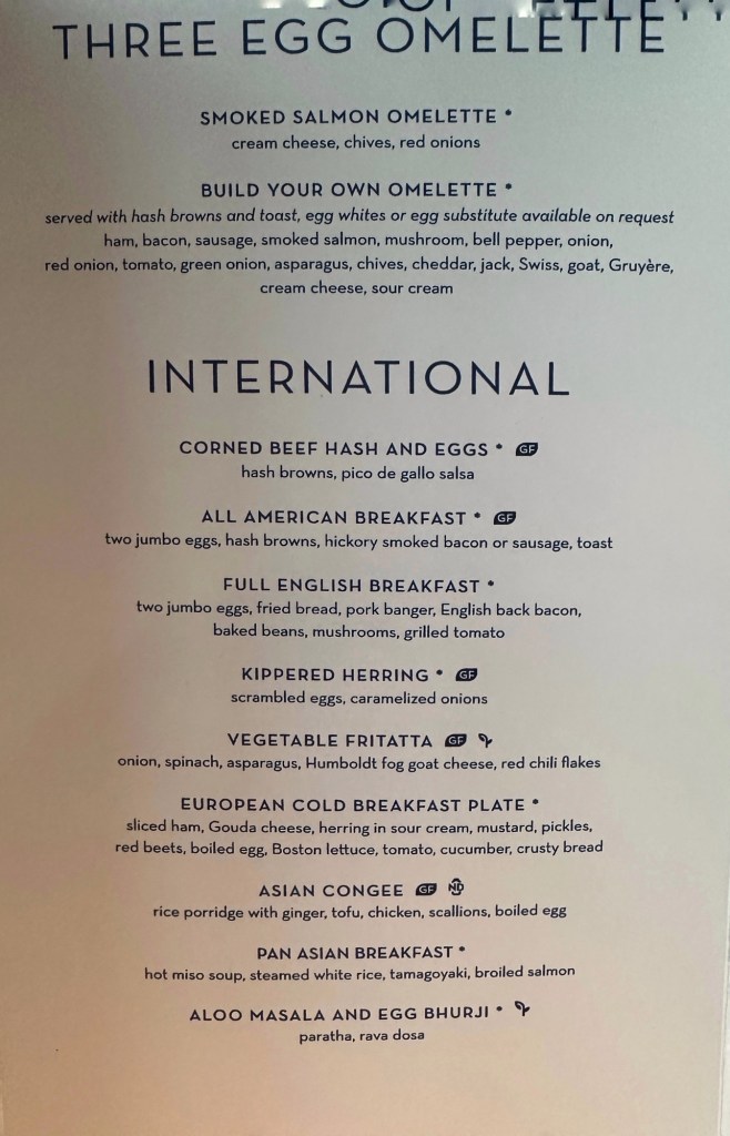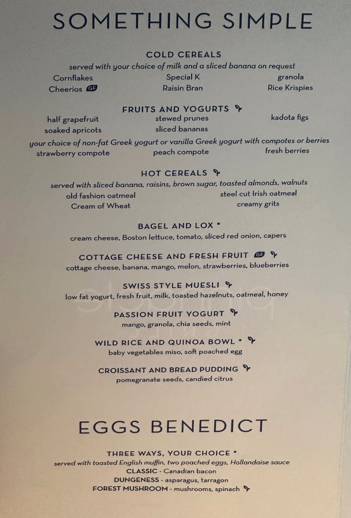 On the culinary note, here is what we can choose from for breakfast most mornings in the separate breakfast restaurant for suites. You may have to tap each picture to make it big enough to read.