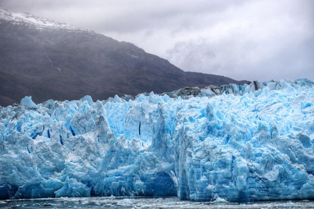 The trip to Pio XI glacier was a pleasant surprise. If you have ever been to Glacier Bay in Alaska, this reminded me of that. The ship slowly moved into the fjord, with small icebergs getting more frequent as you got closer. When the ship got as close as it could, the captain slowly rotated the ship around so everyone got a front ahead view of the glacier. I estimate the glacier edge was probably at least a hundred feet high from the water, with probably another hundred below the waterline. It flows west from the Southern Patagonian Ice Field, and at 41 miles long. It is the largest in the southern hemisphere outside of Antartica. Unlike most other glaciers, Pio XI is actually advancing. Here are few pictures. The first two are we approach the glacier and it turns right up to the ice field. Actually though, Pio XI in the last 50 years hit a mountain straight on (on left), and the glacier to then branched left and right (north and south in this case). You see the southern branch here. What was the same fjord is now trapped on the north side, forming a lake.