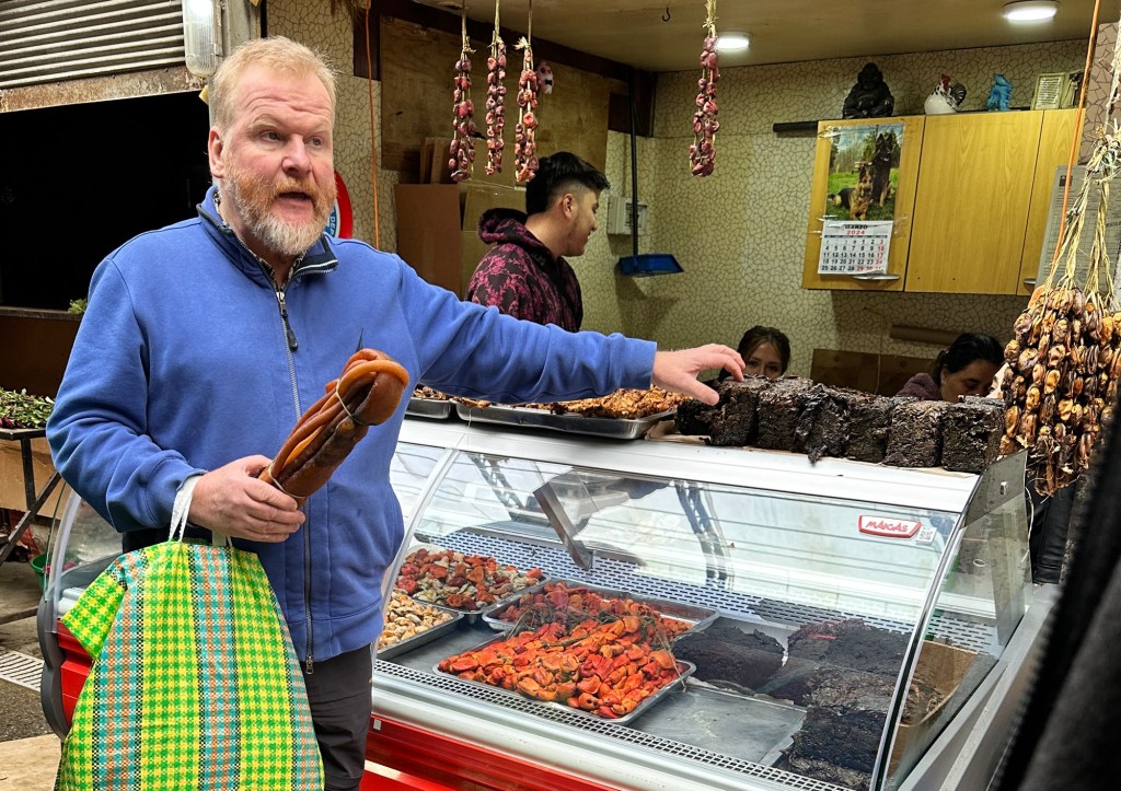Our group of 24 started out in a little bus to the local Angelmo Fish Market, where we meet Chef Richard Knobloch, a German-born chef with a restaurant in nearby Puerto Varas. Chef Richard took us around in the market to buy the food he needed to prepare us a sumptuous lunch. This is both a fish and produce market, so everything he needs was there. The venders sometimes offered samples for us to try or sniff; cheese, blue berries, smoked red pepper flakes and fresh hot peppers, to name a few. At the fish market area, Chef Richard selected several whole Hake fish, mussels, soft-shelled clams, shucked and cooked razor clams, and Sea Squirts. Produce selected included Chilean native multi-colored potatoes, green beans, something that translates to Sweet Cucumbers, kelp, seaweed, big red onions and garlic, blueberries, and cartons of multi-colored eggs. Plush fresh herbs and lemons / limes. It was great fun following him around, asking questions, buying little bags of seasoning and nuts.