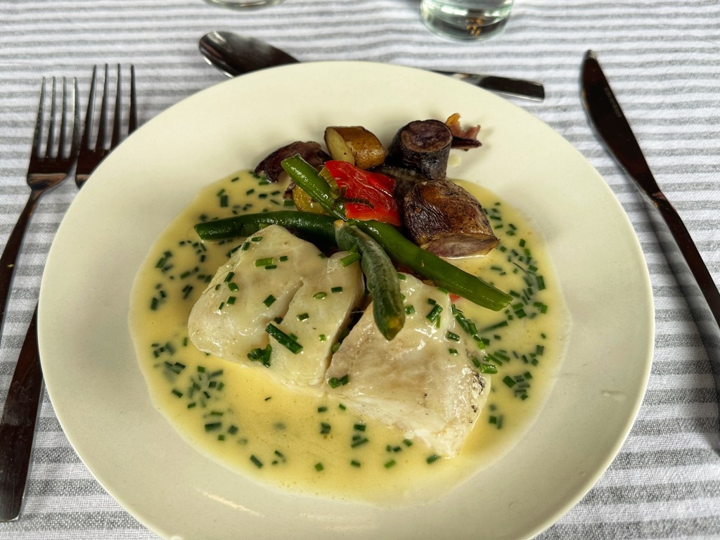 Hake fish with native potatoes, green beans and sweet pepper all in a fish stock and basil sauce