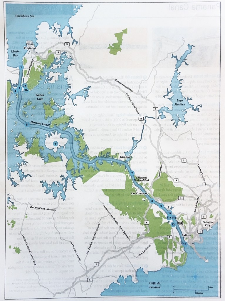 First some background. I won’t go into the detailed history of Panama and the Canal. Just to say, the French failed miserably in their attempt to build a canal modeled after their Suez canal, losing 20k men to malaria. The U.S. attempt around 1911 was better engineered and they first tackled how to battle malaria by first identifying mosquitos as the source, eradicated most mosquitos (unfortunately using DDT), and then a medical cure for malaria. The Corp of Engineers design was to create a lake in the center of Panama, Gatún Lake, by damming the Chagres River. They then needed 2 sets of locks on the Pacific side to get up to the lake water level of 85’ above sea level and 1 set of locks on the Atlantic side. In addition, the Culebra Cut was dug through the continental divide that is about 8 miles long. That’s the canal in a nutshell. In 2016, there was an expansion of additional sets of locks on both ends to handle the larger container ships. I’ve posted the map and guide sheet we were provided as a reference.
