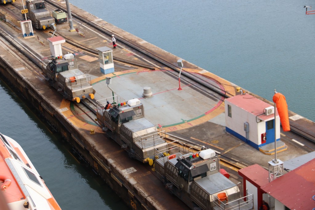 The ship powers itself through the locks, with a Canal Pilot controlling the power and rudders. There are electric “mules” on tracks that have cables from the ship attached so it can guide the ship so as not hit the canal sides. There are two mules used on either side of the ship through the locks. We went to eat a quick breakfast while the ship rose up in the second lock chamber.