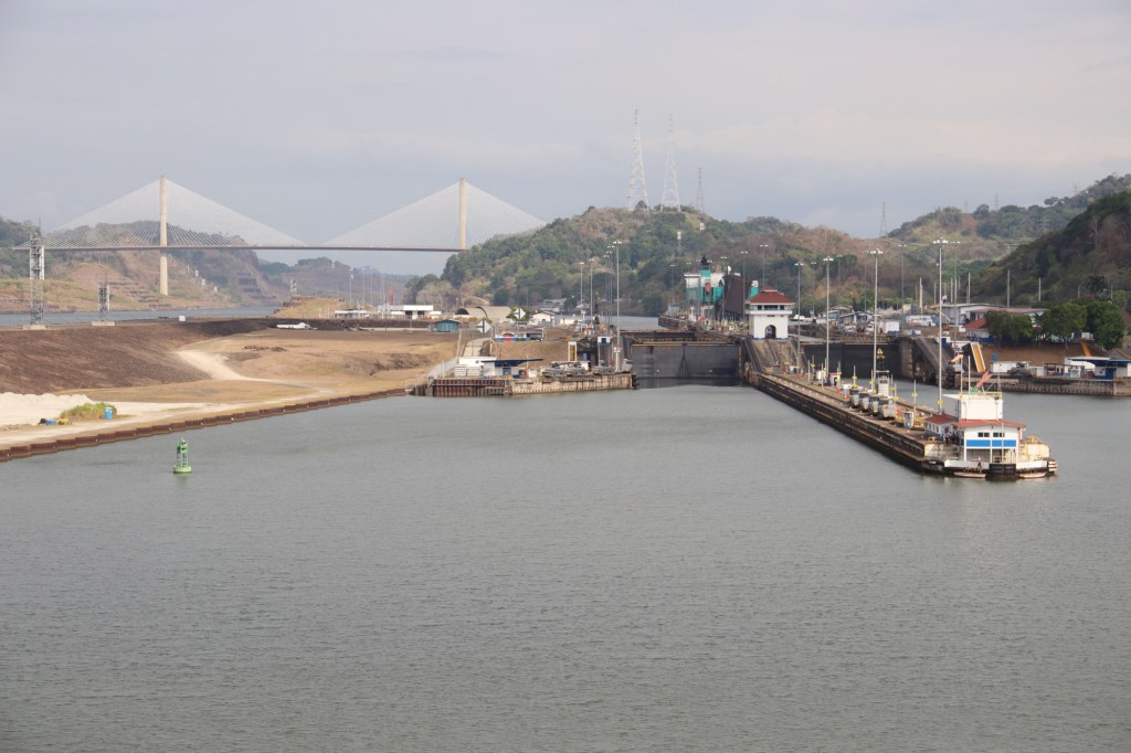 We went to bed the night before with a tentative ship schedule to be in the queue to enter the canal at 6:30AM. but when we woke up at 6:30, we had already entered the canal and gone under the Americas Bridge, heading toward the first set of locks, the Milaflores locks. So, we missed the first of 3 bridges.