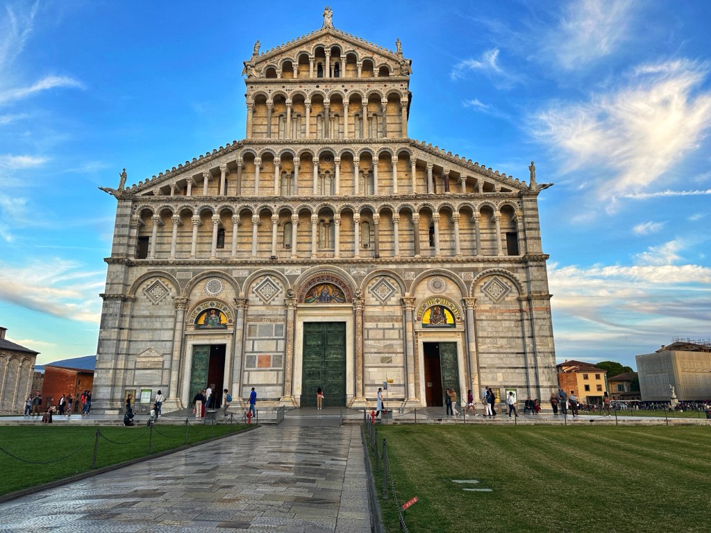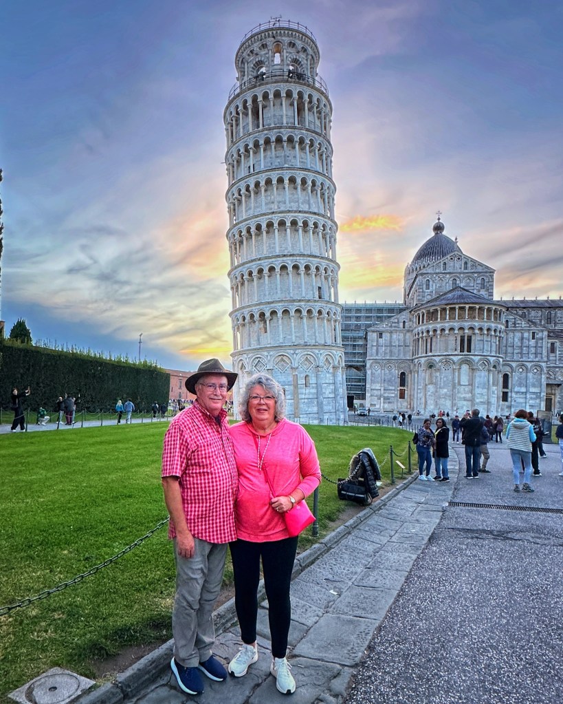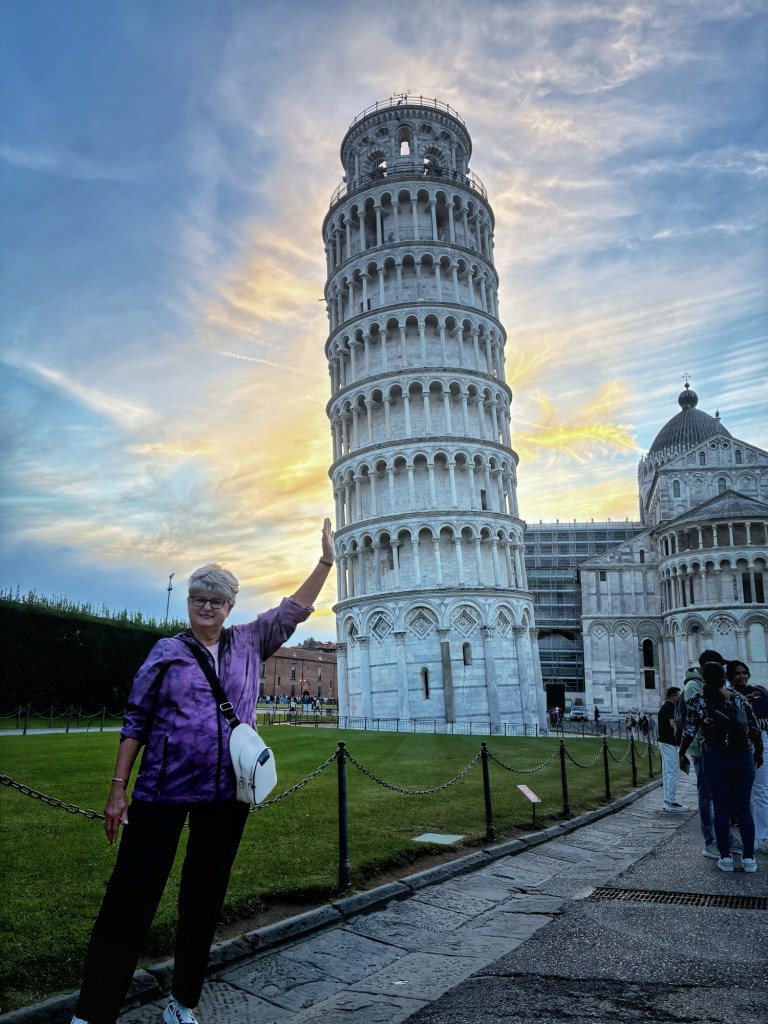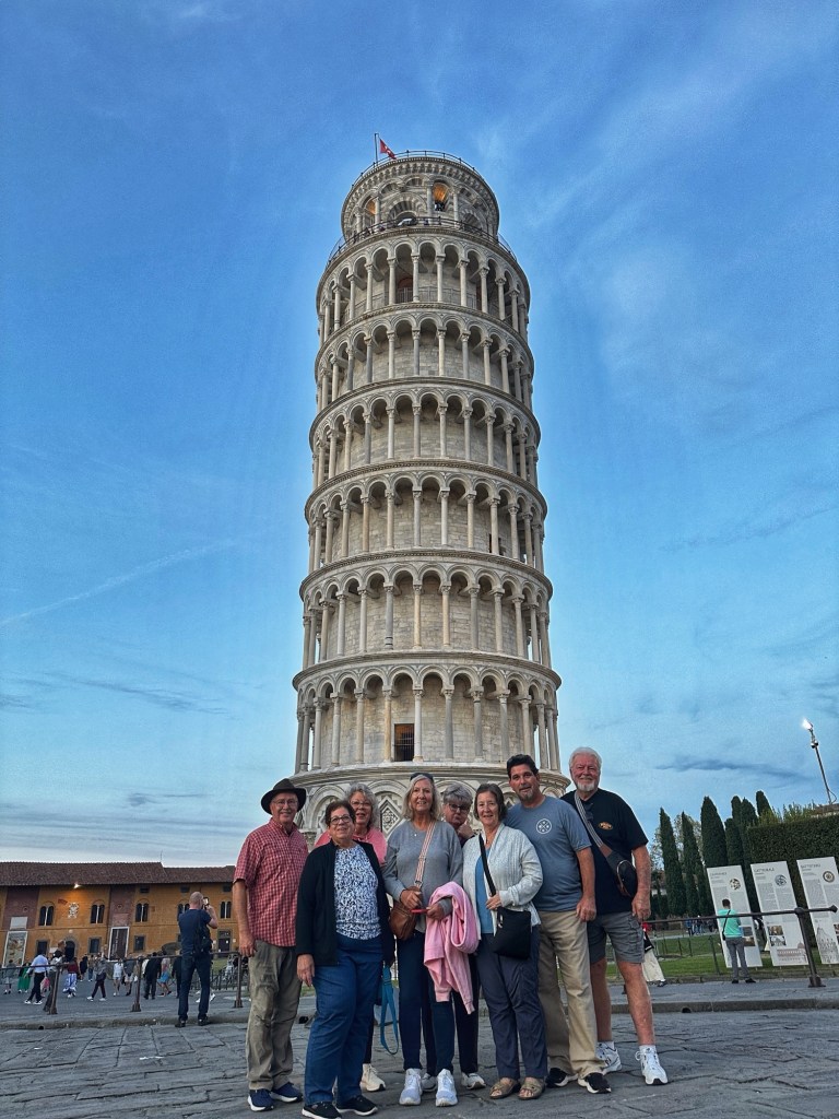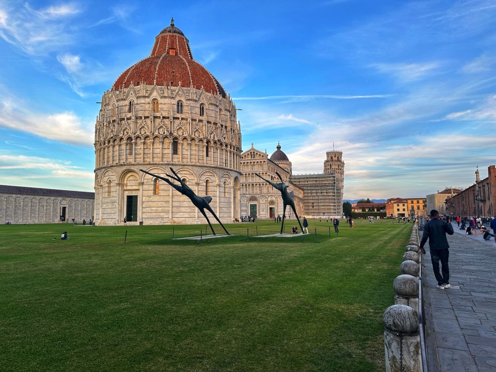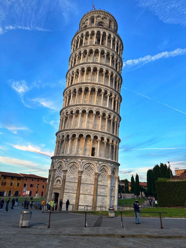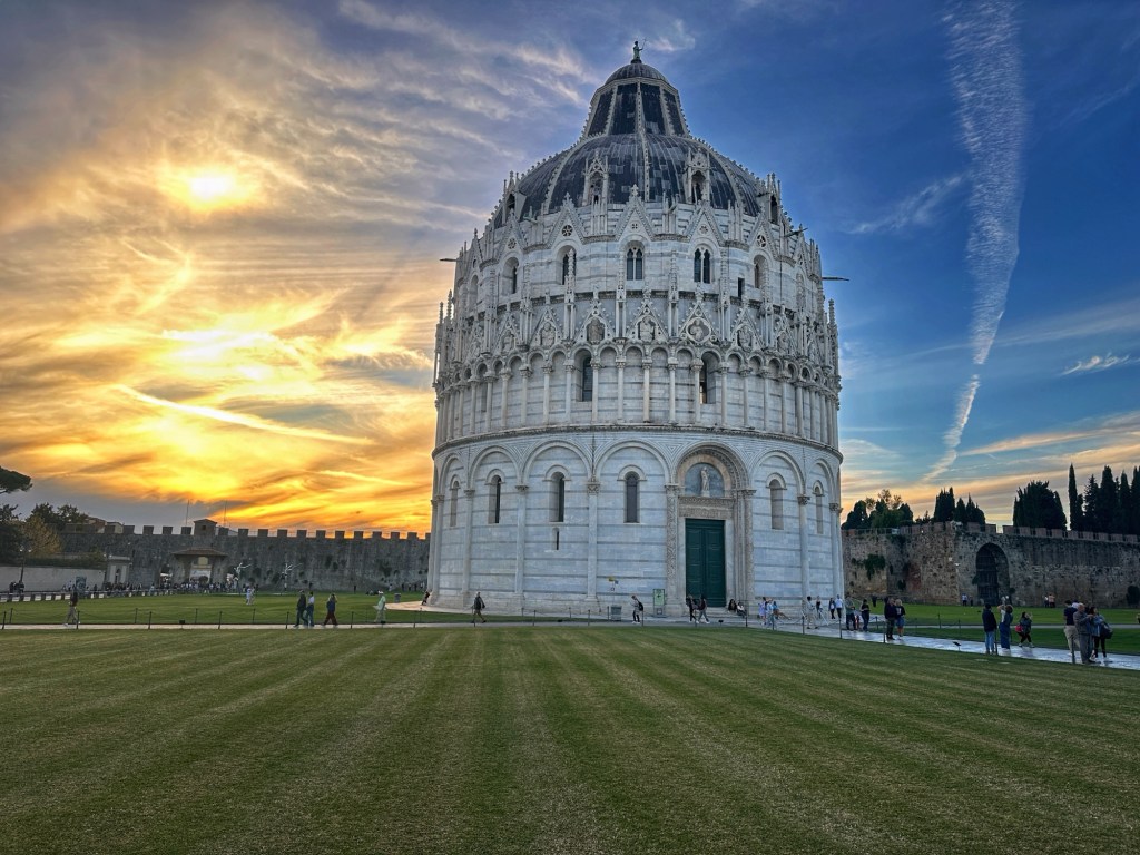 We took the train back to La Spezia and drove an hour to Pisa, arriving around 6PM, just in time for sunset at the Tower of Pisa. While you don’t need tickets onto the grounds around the pisa Cathedral and Tower, you need tickets to go inside and the buildings – cathedral, baptistry, tower and museum. We just walked around the tower to catch it at different sides. Lot’s of fun pictures, just like most everyone else.