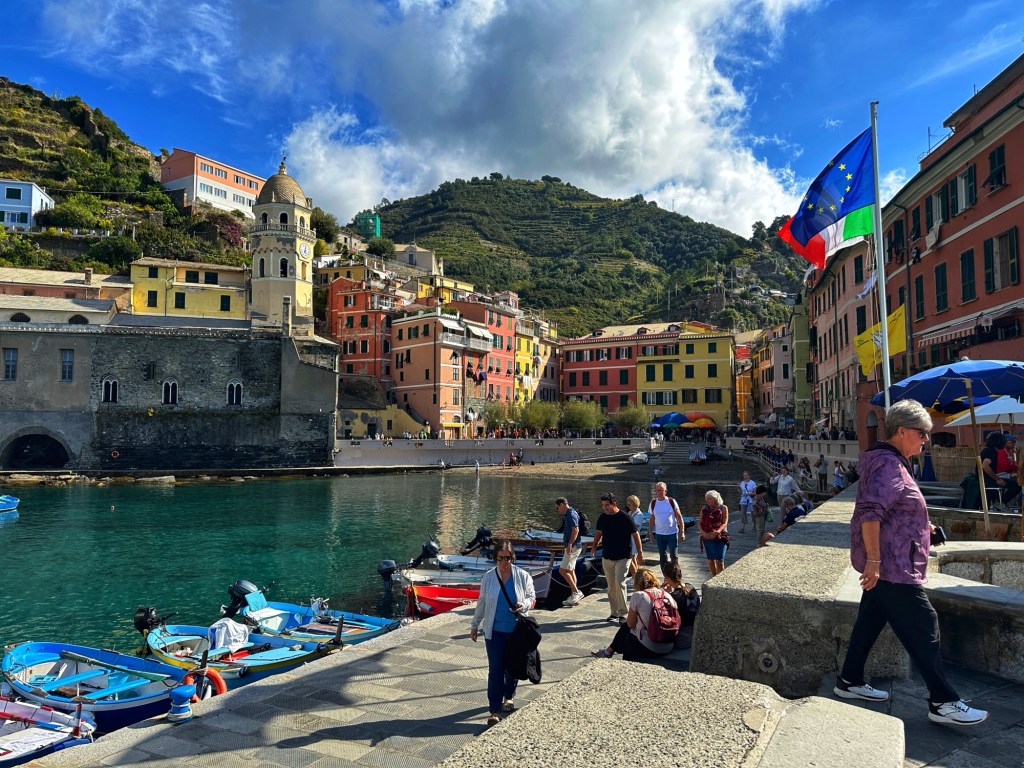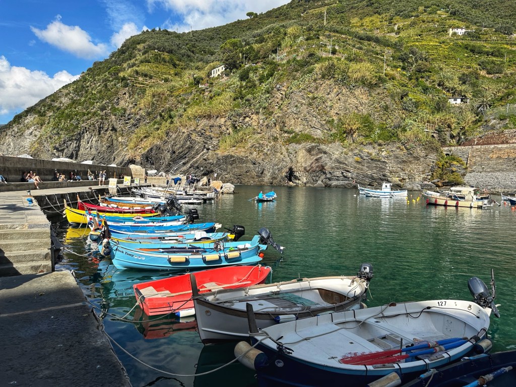 Cinque Terre is a National Park and World Heritage Site. The “Five Earths” are five villages tucked in the rugged Italian Riviera coast that basically are only reached by boat, train or hike. There are roads which are extremely rugged and don’t go all the way into the towns themselves except by permit. Ferries and trains run from the gateway city La Spezia to each town. All within the Cinque Terre National Park, they are also interconnected by hiking trails that traverse up and down the mountains, along the coastal cliffs and through the terraced vineyards and olive groves.