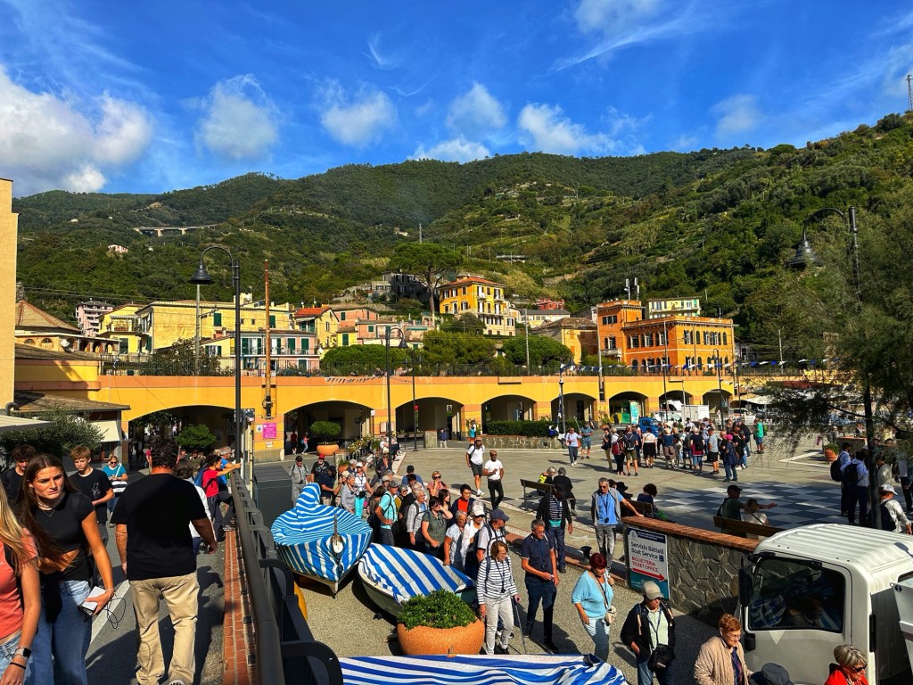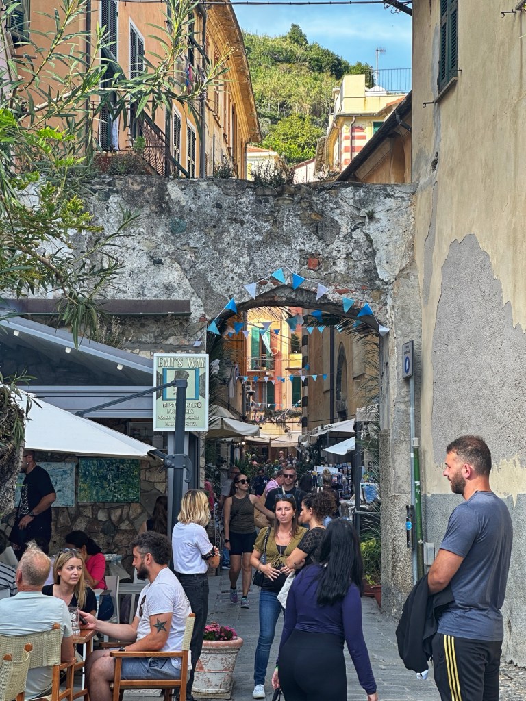 Laura and I had stayed in Vernazza about 15 years ago in November. Today was a lot more crowded than our stay in November. The main street down from the train station to the water was fairly packed with visitors, outdoor cafe seating and vendors. After walking around a bit admiring the stunning sights, we found a restaurant that could seat 8 and had a light lunch. After lunch three of us went up the Cinque Terre trailhead to go up to the higher elevations for a better view, while the others went shopping. We met back at the train station around 1:30 to catch a train to the next town.