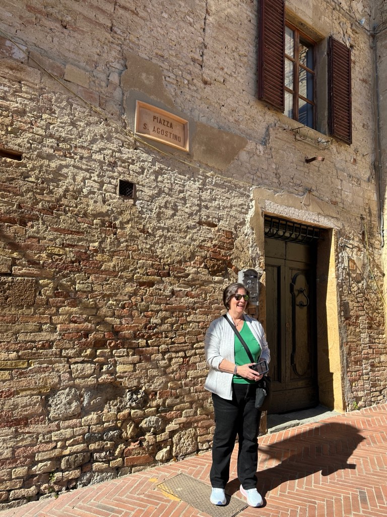 After completing the wine tasting, we were ready to eat. I remembered a little tavern just outside San Gimignano, right near the highway exit, Bar dell’ Orso. Julia had never been there and warned it was a bit small, but I was able to book a reservation using Google Maps. So off we went. When we arrived, they weren’t aware of our reservation but did set up a table for eight. We had a light dinner, soups, panni’s, deli meat assortment, and small pasta dishes. And then a band started to set up and by 9 began to play American/British oldies! By then the restaurant staff told us we really needed to give up our table for another party reservation. We were welcome to continue drinking, just not at our table.