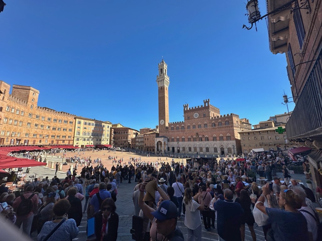 Siena was bit more crowded and without any of the towers still surviving like San Gimignano. What is unique is the gigantic Piazza del Campo in the center of town. Del Campo is not flat, but somewhat shaped like a scallop shell, about 500 ft x 200 ft. It’s large enough that they run horse races in the Piazza.