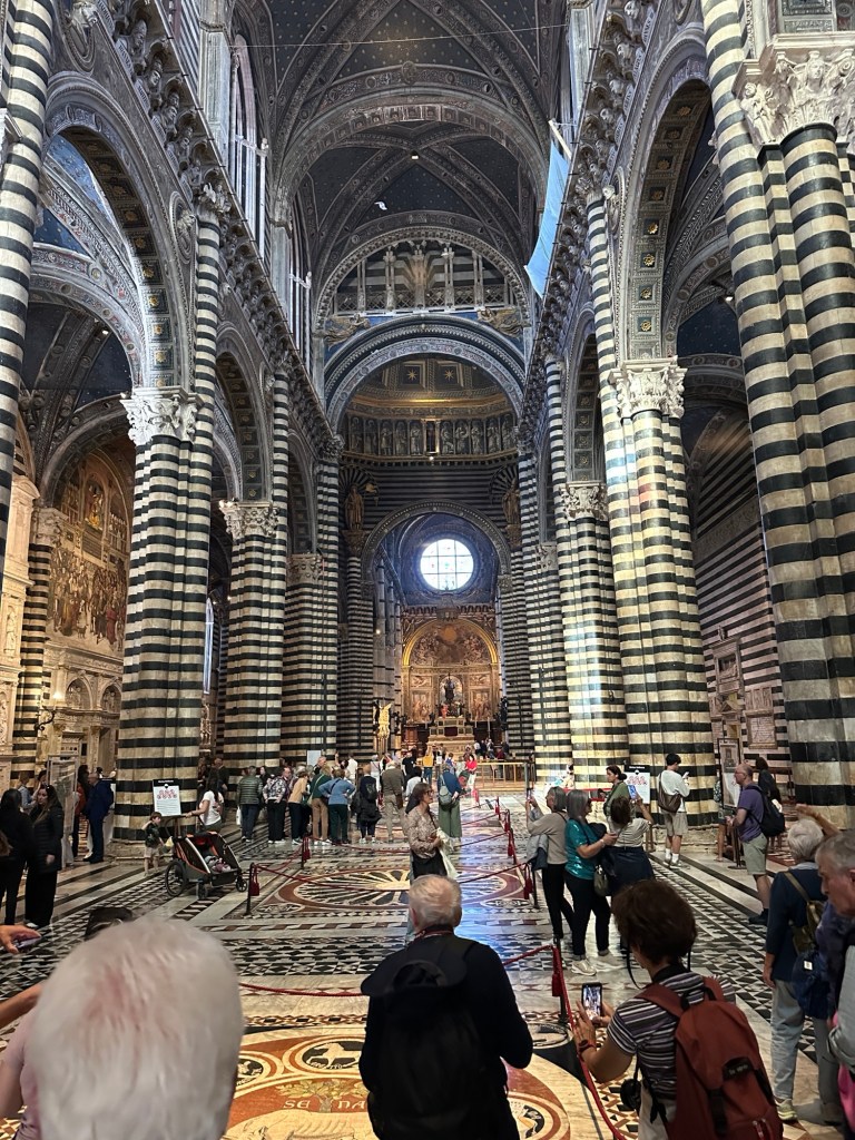 Siena Cathedral is covered inside and outside with white and green marble. Very beautiful. May make you think of Beetlejuice with the striped pillars.
