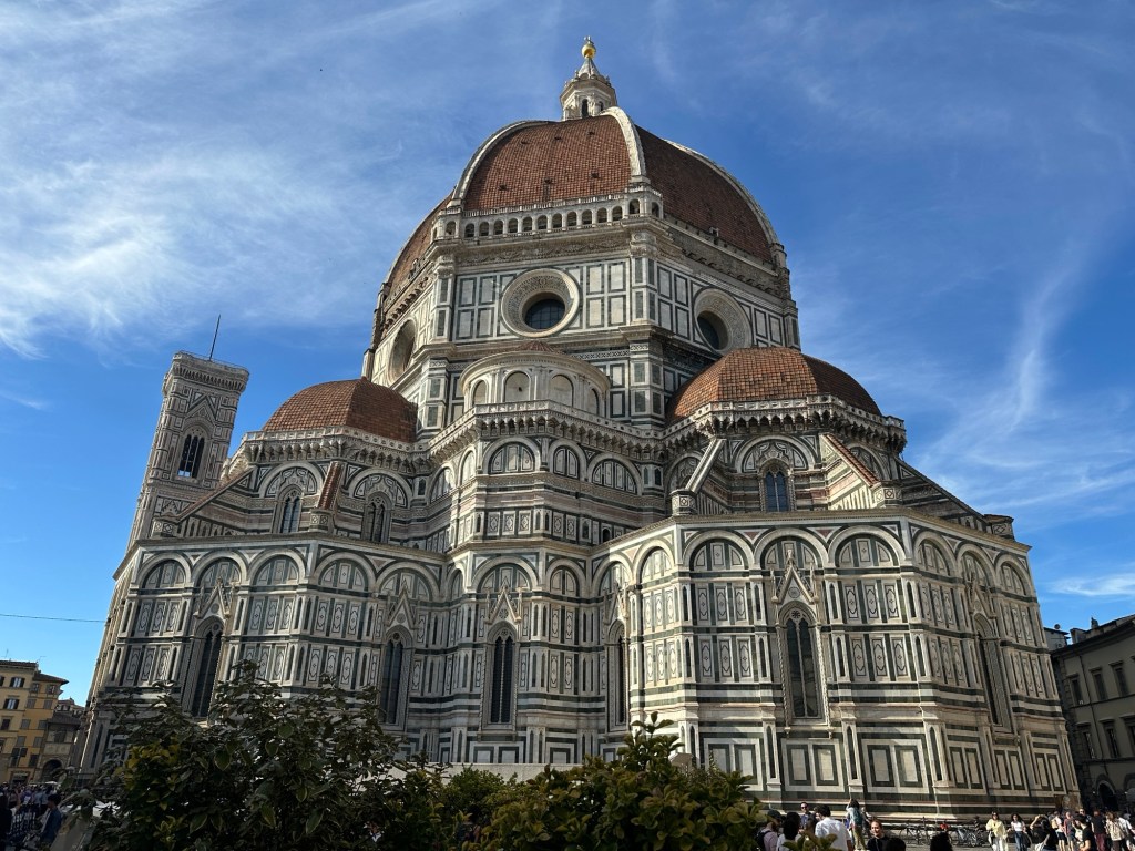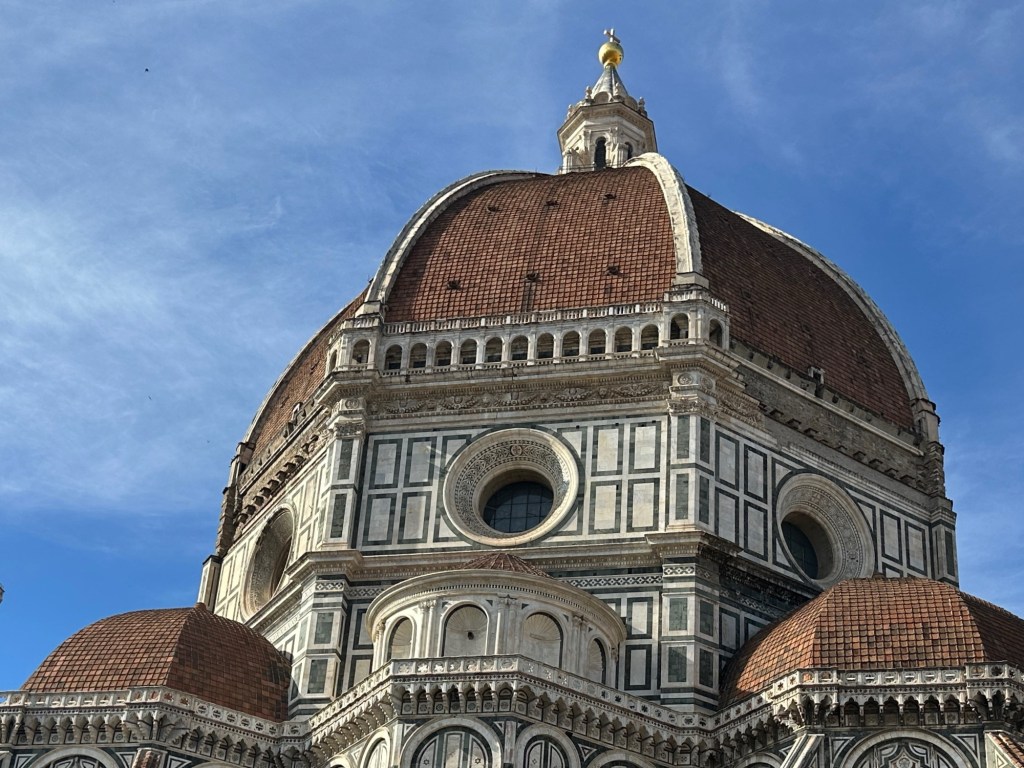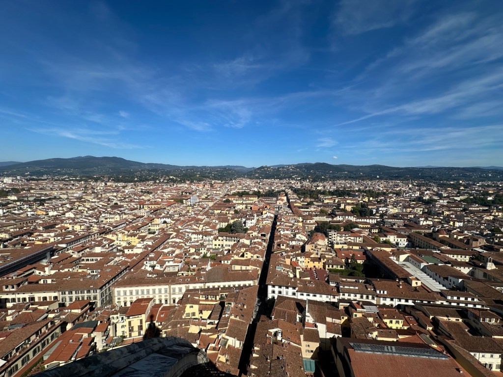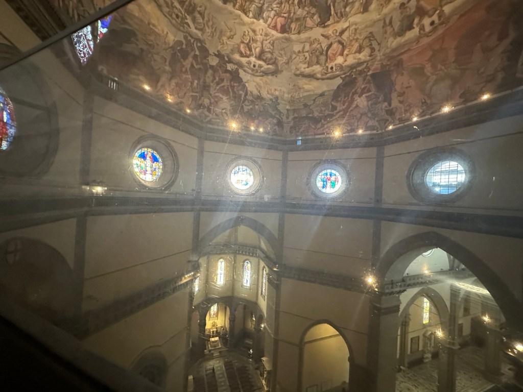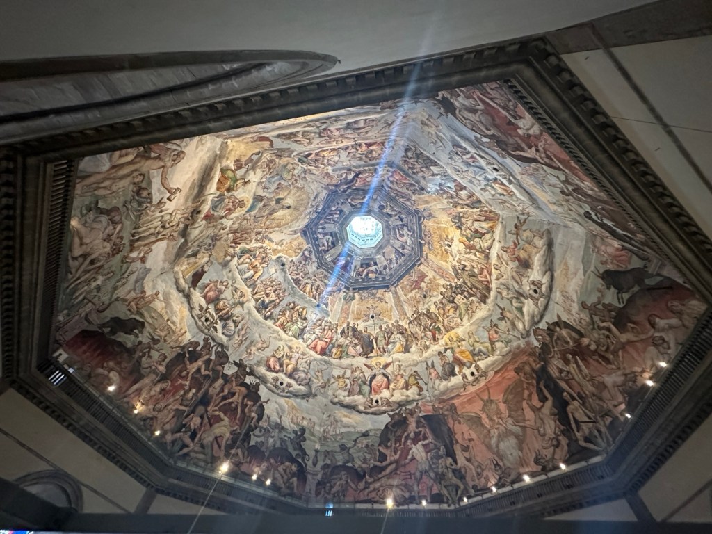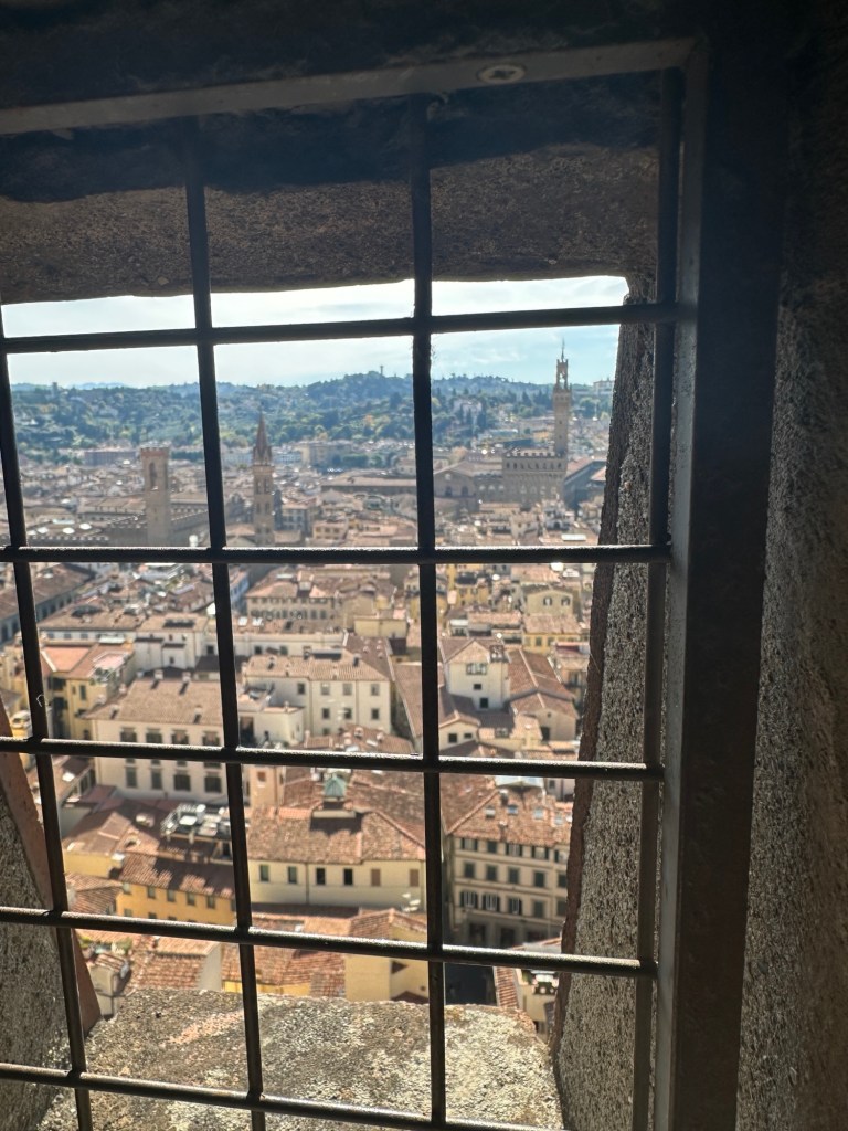 After the Da Vinci Museum, four of us had opted to climb the Duomo Dome. There are 463 steps to the top of the Florence Duomo dome. Our timed tickets were for 12:45, the first time slot after the church was dedicated to Sunday services. We arrived 10 minutes early and the line was already 50+, but once they started letting people in, we were walking into the cathedral in no time at all. What an experience! Worn stone steps, over a thousand years old, wind up the cathedral wall with a periodic small platform for a change in step direction that we could use to rest a few minutes or enable everyone to catch up. Once you get to the base of the dome, you walk out into the cathedral with a direct view up at the Last Judgement fresco on the dome ceiling painted by Giorgio Vasari – Federico Zuccari in 1572-1579. We traverse around a quarter of the dome circumference on a walkway before reaching a new set of slowly spiraling steps up between the inner and outer dome structures. Then we traversed a second walkway further up in the dome. From there, you look down at the mosaic floor of the cathedral or closer views up at the fresco. The final step segment was steep tightly spiraled tiny steps. Your legs are like rubber, but you hear others outside, so you push up. A final straight step of a dozen steps takes you up to the “latern” structure at the top with a large viewing platform you can go around to see all angles of the city.