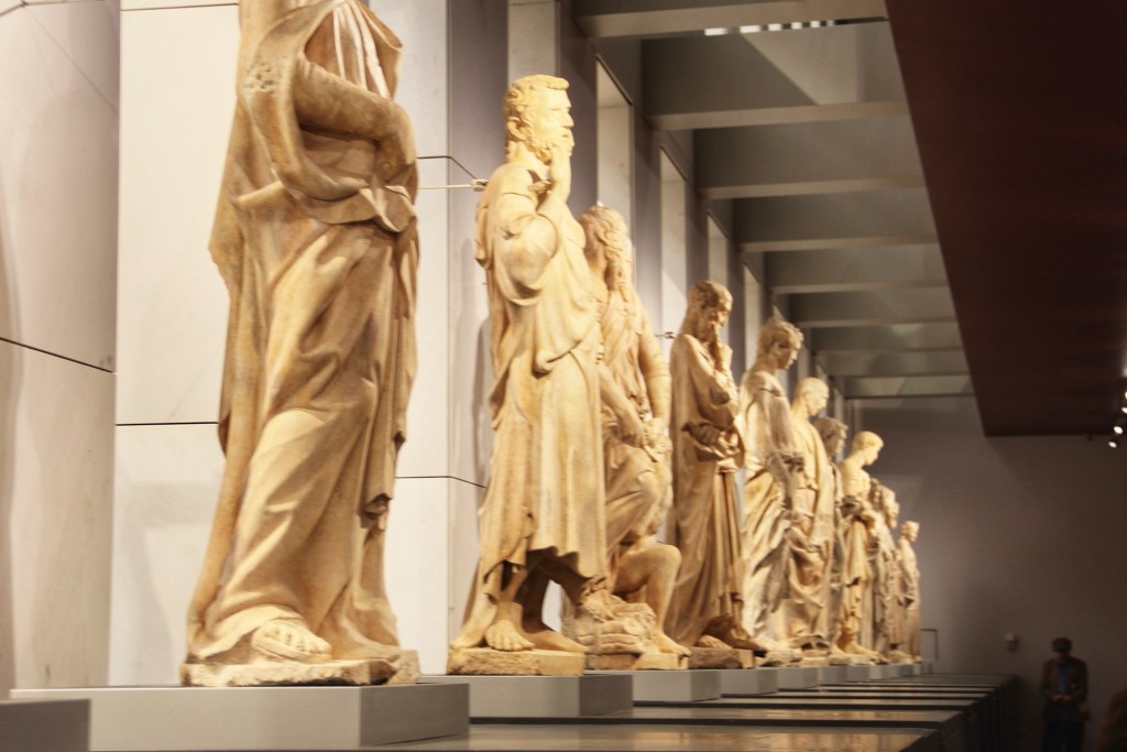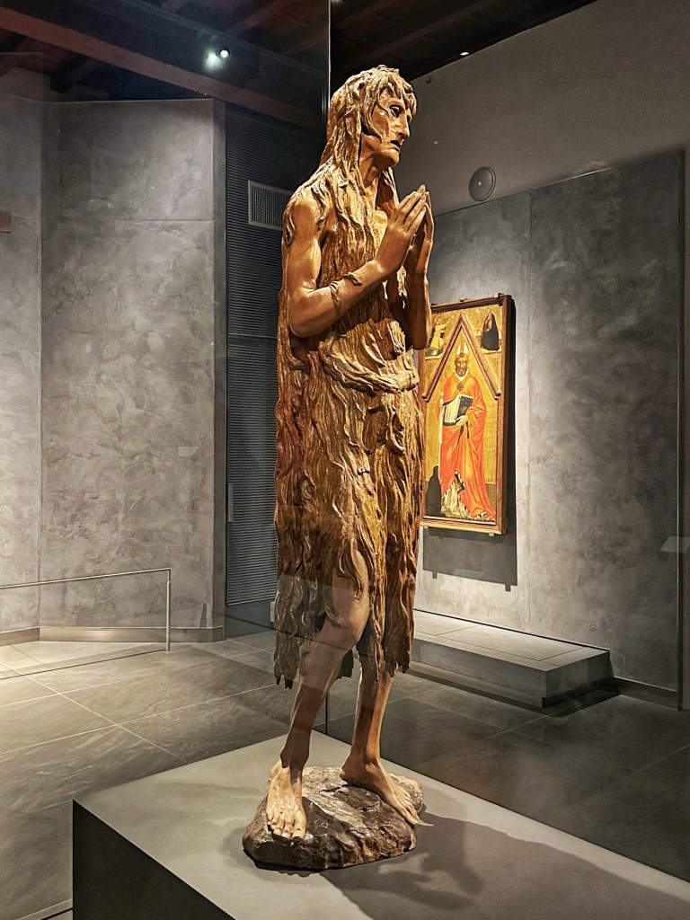 The museum is housed in a non-descript building behind the cathedral. It was the original workshop and storage warehouse during construction starting in 1296. The dome wasn’t completed until 1436, with the “golden ball” placed on top in 1471. The final marble facade was completed in 1887, which meant the church exterior was simply brick until that time. The original statues around the church and the carved Baptistry doors were moved indoors to this warehouse, when the marble facade was installed, with replicas created to replace the originals. Today’s modern museum now showcases these originals. Cristina showed us the difference between the stillness and lack of anatomical details of most artists of the time, versus the innovative work of Donatello, whose work showed emotion, anatomical details and motion. His influence on others like Michelangelo is readily apparent. Christina had us walk all around Michelangelo’s Pieta. It was then that you realize there used to be a swirling flow of the statue, with the bodies twisting, arms and legs all moving in a common circular direction. Motion captured in a marble statue.