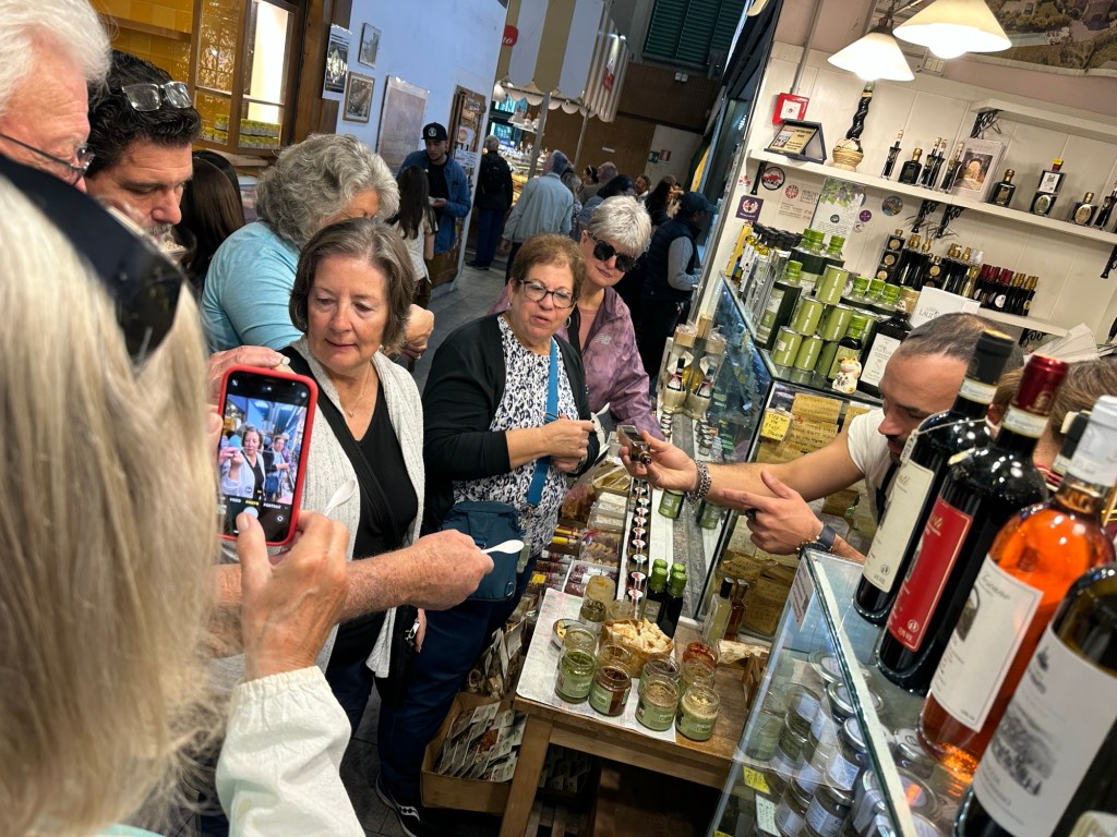 Three of us had come here yesterday and found the booth selling olive oil. I found the booth again and the whole group came! When the woman, Paola, recognized Laura, Laura exclaimed she loved her products so much she brought all her friends today! We discovered they also produced Balsamic Vinigrette. Paola and her son Roccardo offered us a tasting of their various aged balsamic, ranging from 5 to 60 years old, aged in small oak barrels. Everyone got a plastic spoon and she poured a drop onto the spoons. We tasted 5 year old balsamic, 12 years old, 25 years old and 60 years old. I noticed the taste got stronger with more aging, more oaken flavor. All of them had richer flavors than anything I’ve tasted at home, and they got thicker with age as well. Prices ranged from around €10 to over €60 depending on the age. I liked the No. 25 flavor the best. The bottle held 50 ml (1.7 oz) of balsamic and sold for €25.