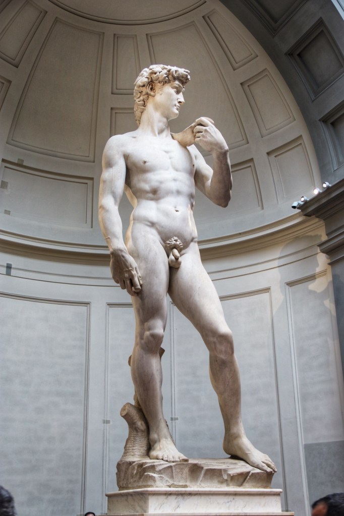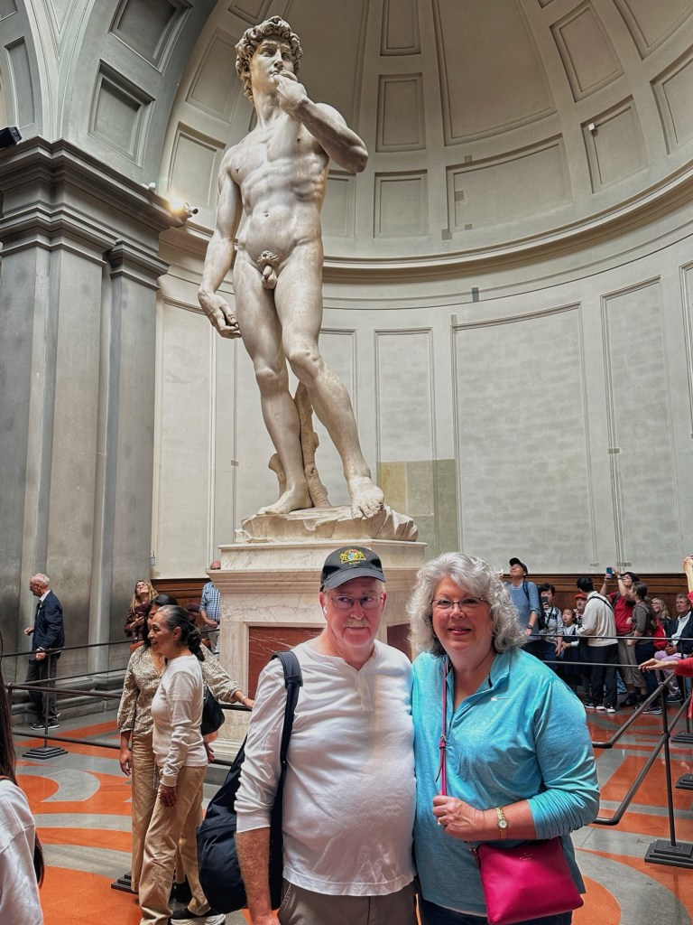 When arriving at Via Ricasoli, we hit a huge crowd, all waiting to get into the museum. There appeared to be 3 lines, 13:30, 13:45 and Nor Reservation. We got at the end of the 13:30 / 13:45 lines ( at that point merged). After waiting nearly 30 minutes with small movements in the line, we got up to the point where the lines split. By then it was the 13:45 and 14:00 lines. It moved much faster then and we soon found ourselves inside going through security. I encouraged everyone to download the free Rick Steves Europe app, as it included an audio guide of the Academia Gallery. We followed Rick’s verbal guidance and pushed up towards the Michelangelo masterpiece statue of David at the end of a long gallery hall. Rick described the history of the statue and its unique features. The crowd was not as packed as at the Mona Lisa in the Paris Louvre, but it was pretty full, with everyone trying to take pictures and selfies.