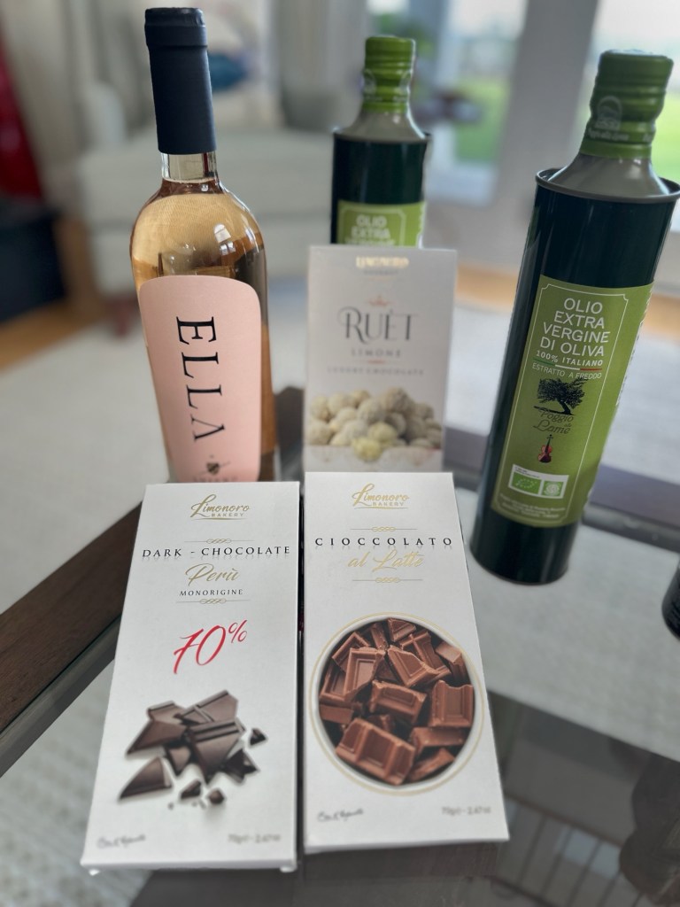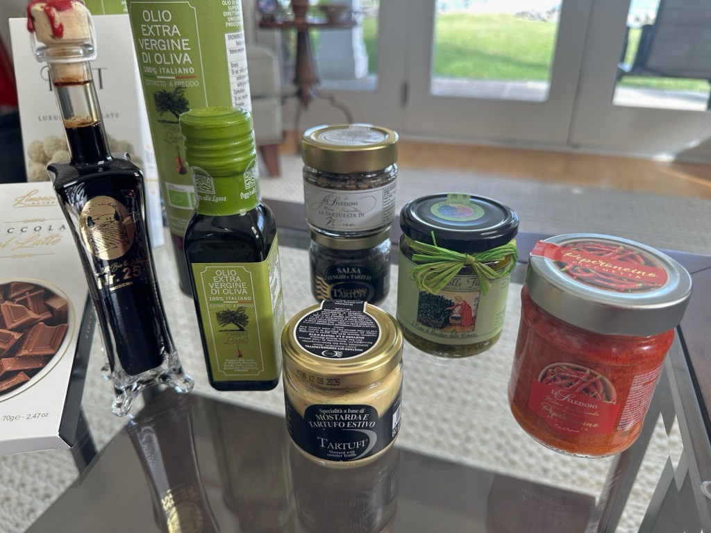 But then we tried the various sauces. Sauces made with mushrooms, truffles, peppercinos, mustards and pesto. They were so delicious, we had to get some. Others bought homemade candies, sort of like hard and soft taffy, mixed in with pistachios or almonds. Here are photos of some of the food and drink we purchased during this trip.